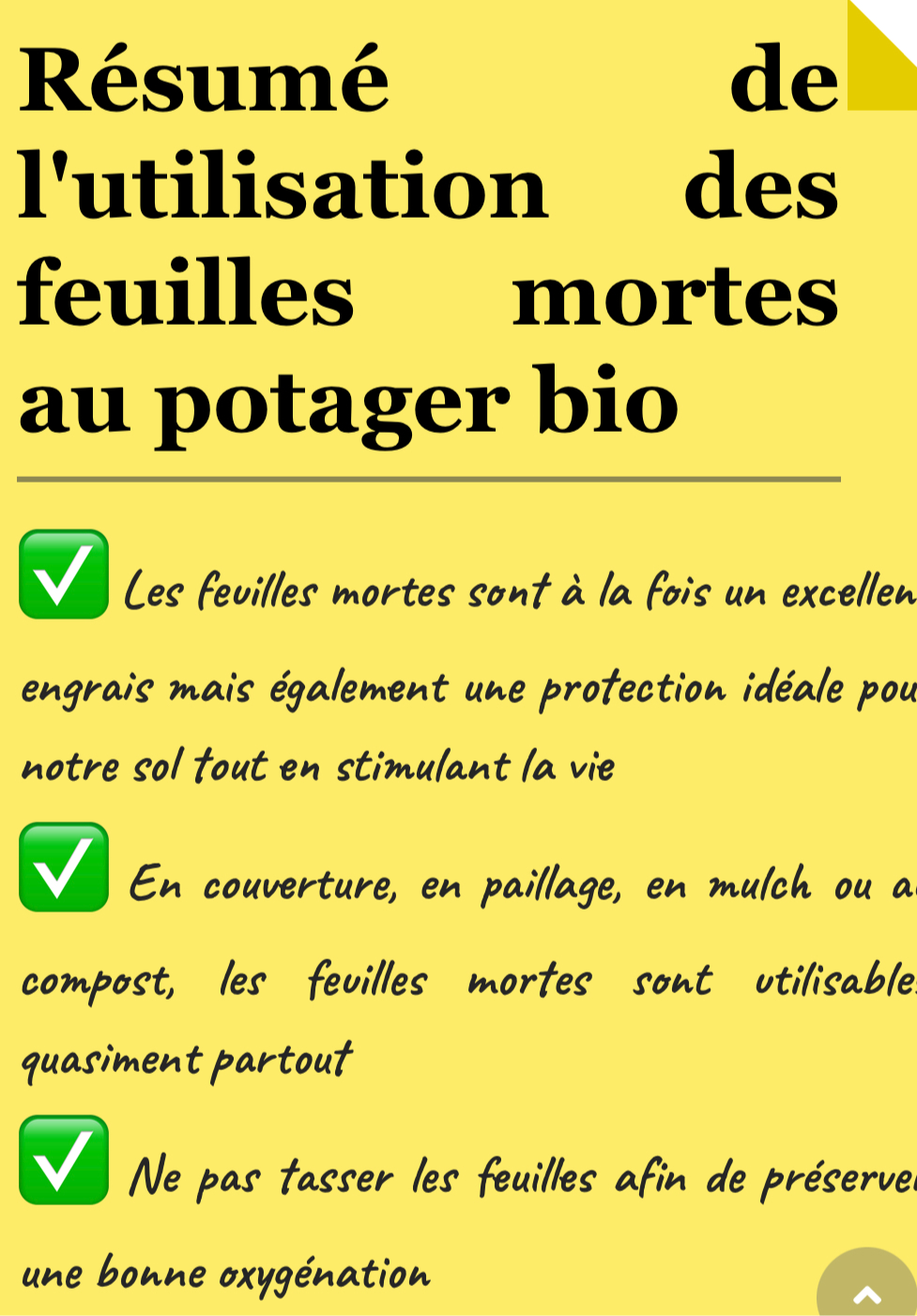 On peut aussi utiliser les feuilles en paillis / paillage pour protéger des plantes pérennes qui parfois sont sensibles au gel, le paillis permet également de limiter la pousse des mauvaises herbes et d’éviter la corvée du désherbage ...